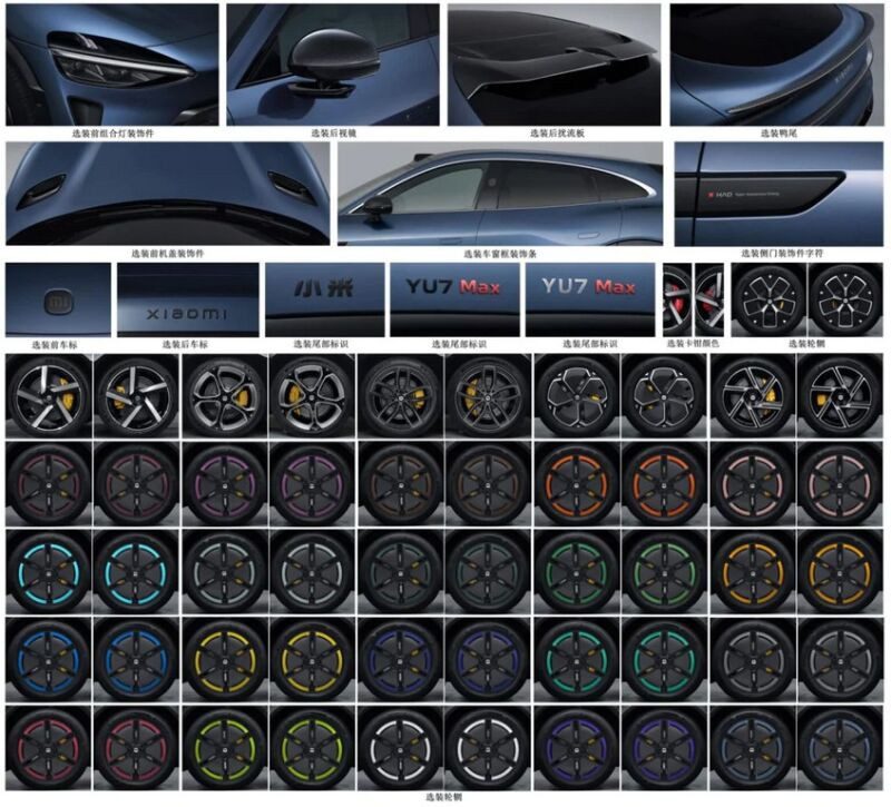 Зокрема стало відомо, що новий Xiaomi YU7 можна буде оснастити колісними дисками з яскравим декором – запропонують на вибір два десятки кольорів. Крім того, в якості опції буде доступний карбоновий декор.