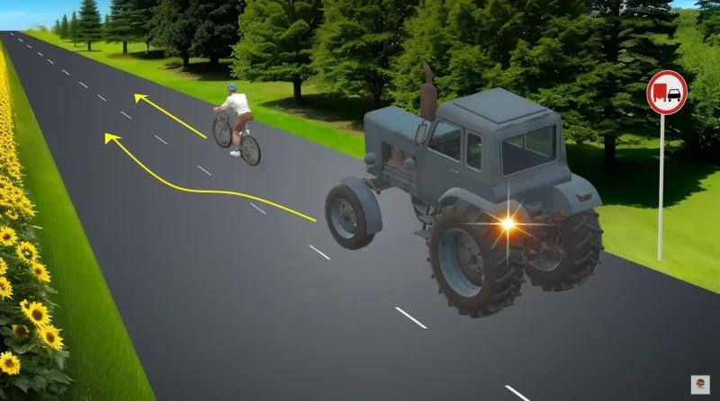 Саме такий тест пропонує YouTube канал “За! Правилами”. На зображенні ми бачимо пряму ділянку дороги по якій рухаються в одному напрямку велосипедист і водій трактора.