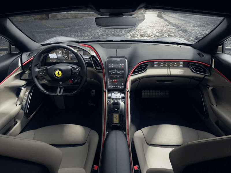 4,6-метрове чотиримісне купе Ferrari Roma вирізняється елегантним стрімким дизайном із вираженим “носом”, довгим капотом та вигнутою лінією даху. У салоні встановлено три дисплеї, один із яких призначений для пасажира.