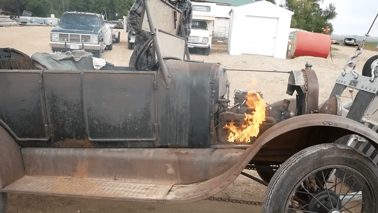 Двигун Ford T покритий шаром бруду, а у двох його циліндрах знайшли гнізда мишей. Мотор відчистили і відремонтували магнето та подали пальне – і він ожив, хоча при цьому навіть загорівся.