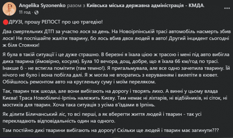 Сизоненко звинувачує у цій ситуації чиновників КМДА, які про проблему знають роками, але нічого не роблять. За словами автоексперта Андрія Г., зіткнення з лосем – це удар, який може зрівнятися з наїздом на бетонну плиту.