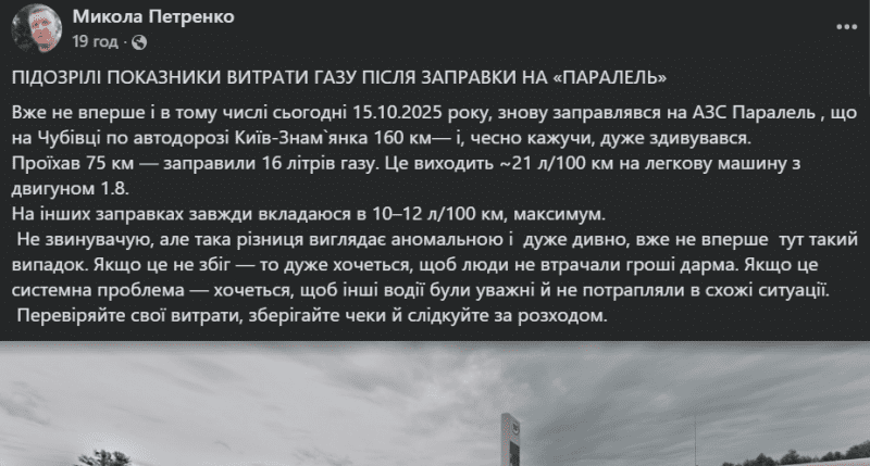 Користувач Facebook Микола Петренко розповів, як після заправки його автомобіль почав витрачати більше 20 літрів на 100 км шляху – удвічі більше від звичного.
