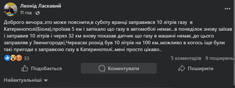 Своїм досвідом в окремому дописі поділився і інший користувач з Черкаської області Леонід Ласкавий. Чоловік розповів, що двічі заправився по 10 літрів у Катеринополі, але газ зникав після кількох кілометрів.