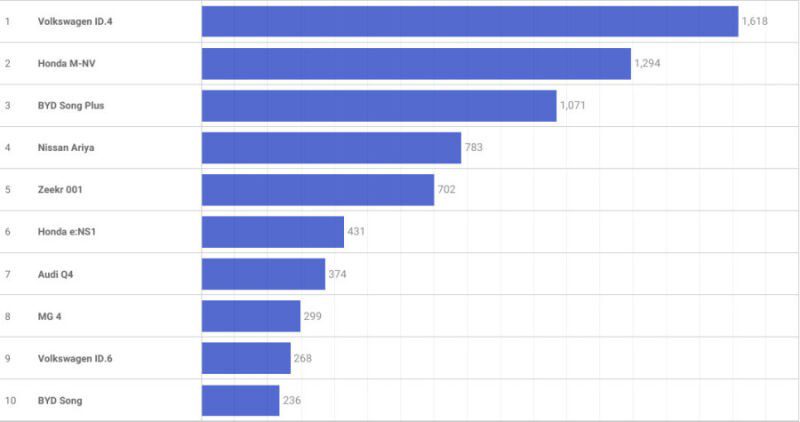 Трохи відстав від німецького виробника BYD з показником 1969 машин. Замикає топ-3 японська Honda з показником 1799 електромобілів.