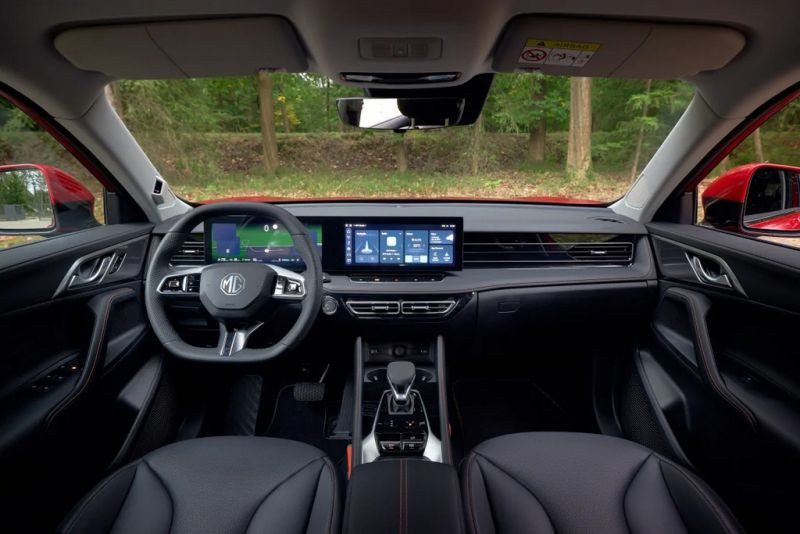 У салоні на передній панелі встановлено два 12,3-дюймових дисплеї. Новий MG HS 2025 став просторішим усередині, а об’єм багажника зріс до 507-1484 л у бензинових версіях і 441-1291 л – в гібридах.